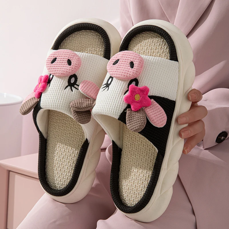 Тапочки домашние женские на нескользящей подошве, дышащие Шлепанцы из льна, на платформе, домашняя обувь, молочная корова, осень 2024