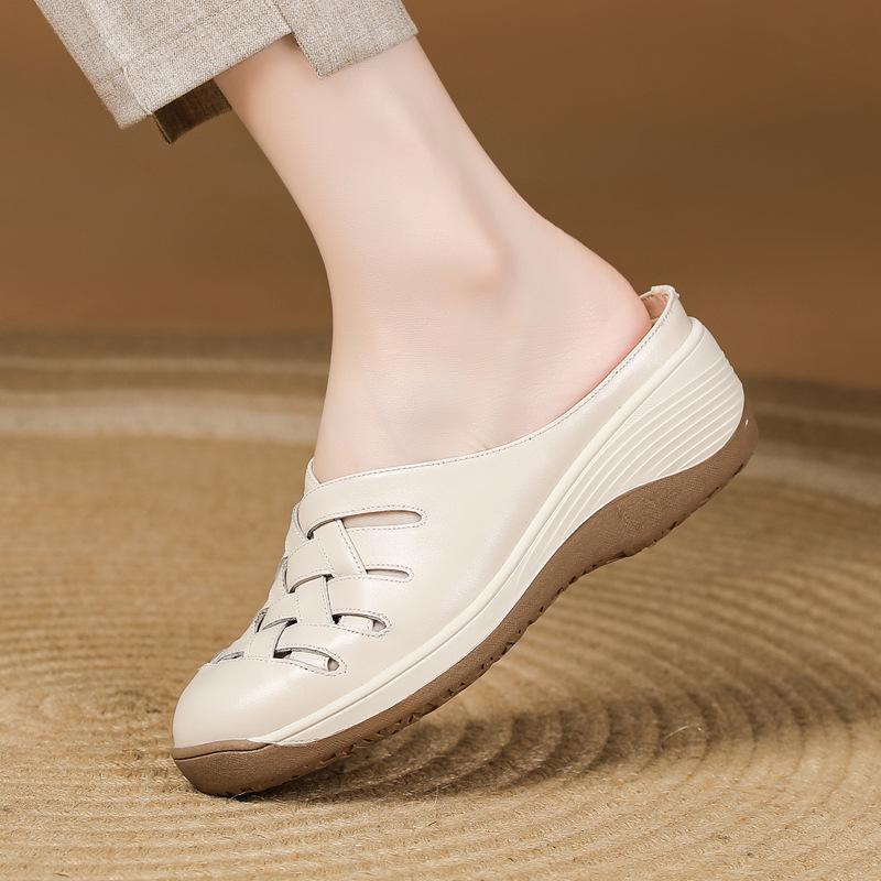 Тапочки женские для улицы летние на толстой подошве повседневные туфли кожаные на мягкой подошве нескользящие с закрытым носком полые сандалии 38