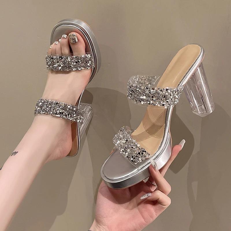 Тапочки из ПВХ с кристаллами на высоком каблуке, лето 2024, модные роскошные сандалии, прозрачные массивные туфли, шлепанцы, туфли-лодочки, женские шлепанцы 35