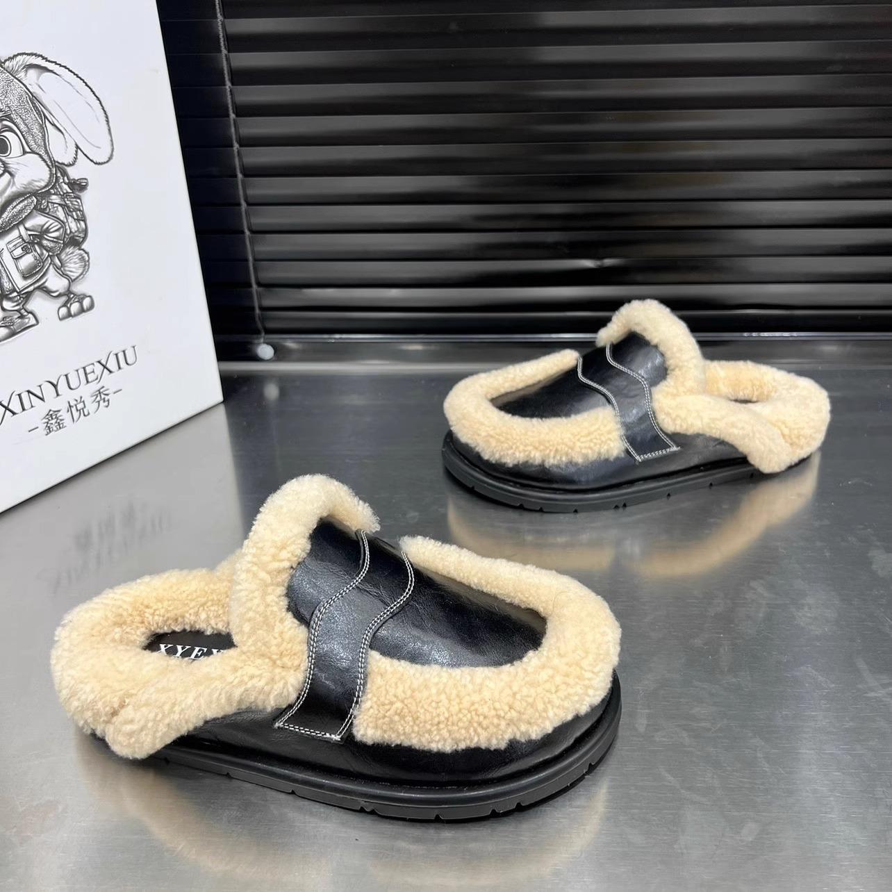 Тапочки на плоской подошве из хлопка на платформе, женские меховые мюли, зимняя новая обувь 2024 года, плюшевые теплые шлепанцы, трендовая мягкая кожа, удобная повседневная обувь 36 чёрный