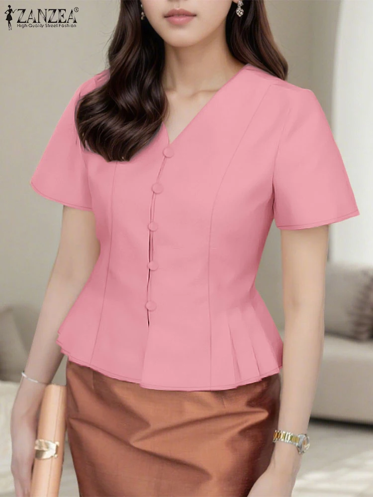 ZANZEA Elegant Short Sleeve Shirts Office Lady Satin Blusas 2025 Women Summer Blouse Sexy V-Neck Solid Tunic Fashion Casual Tops