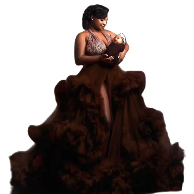 Темно-коричневое платье с лямкой на шее, ТРАПЕЦИЕВИДНОЕ платье для беременных для фотосессии, ПУШИСТЫЕ платья из тюля с оборками в нескольк...
