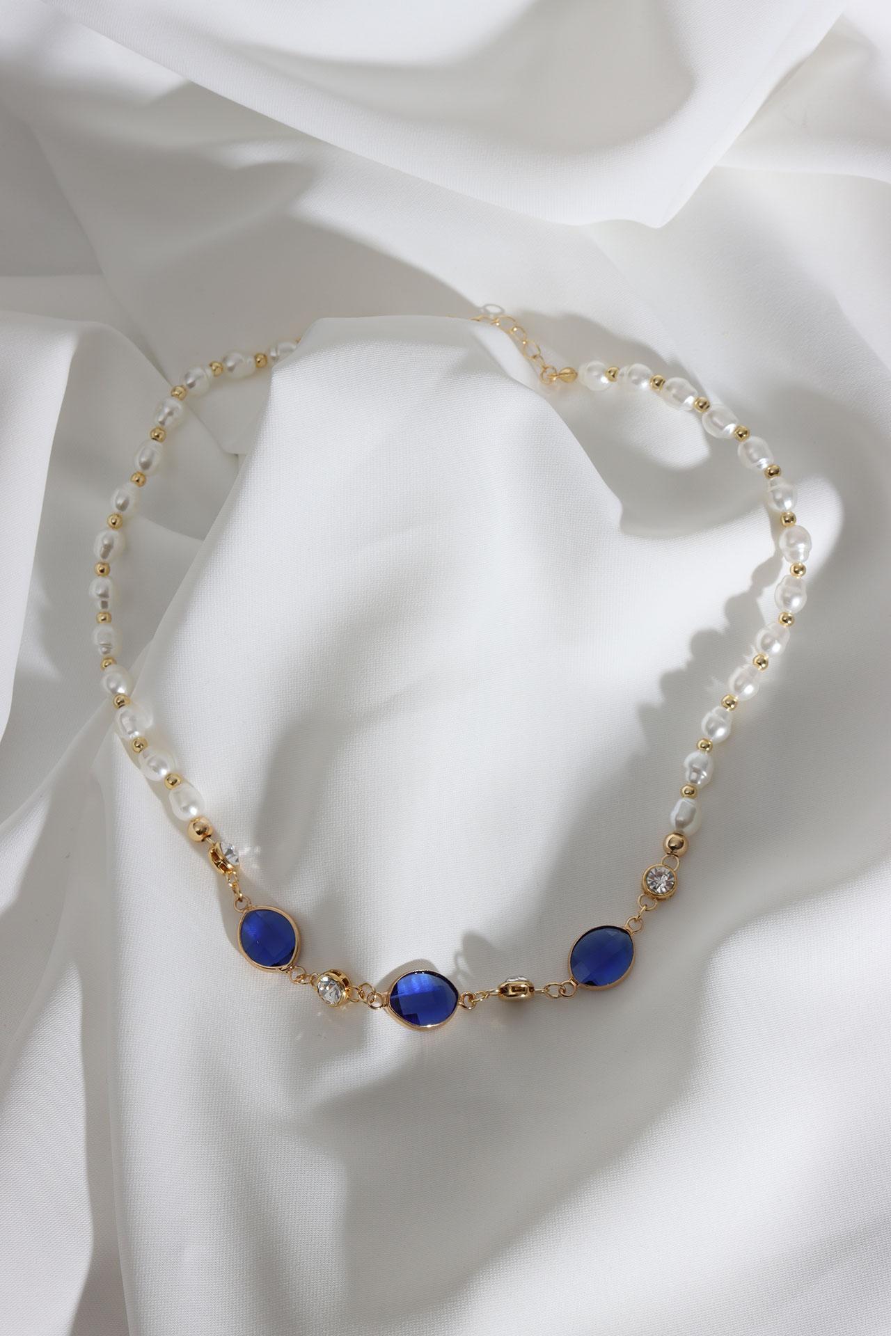 Темно-синее овальное ожерелье с жемчугом и камнями