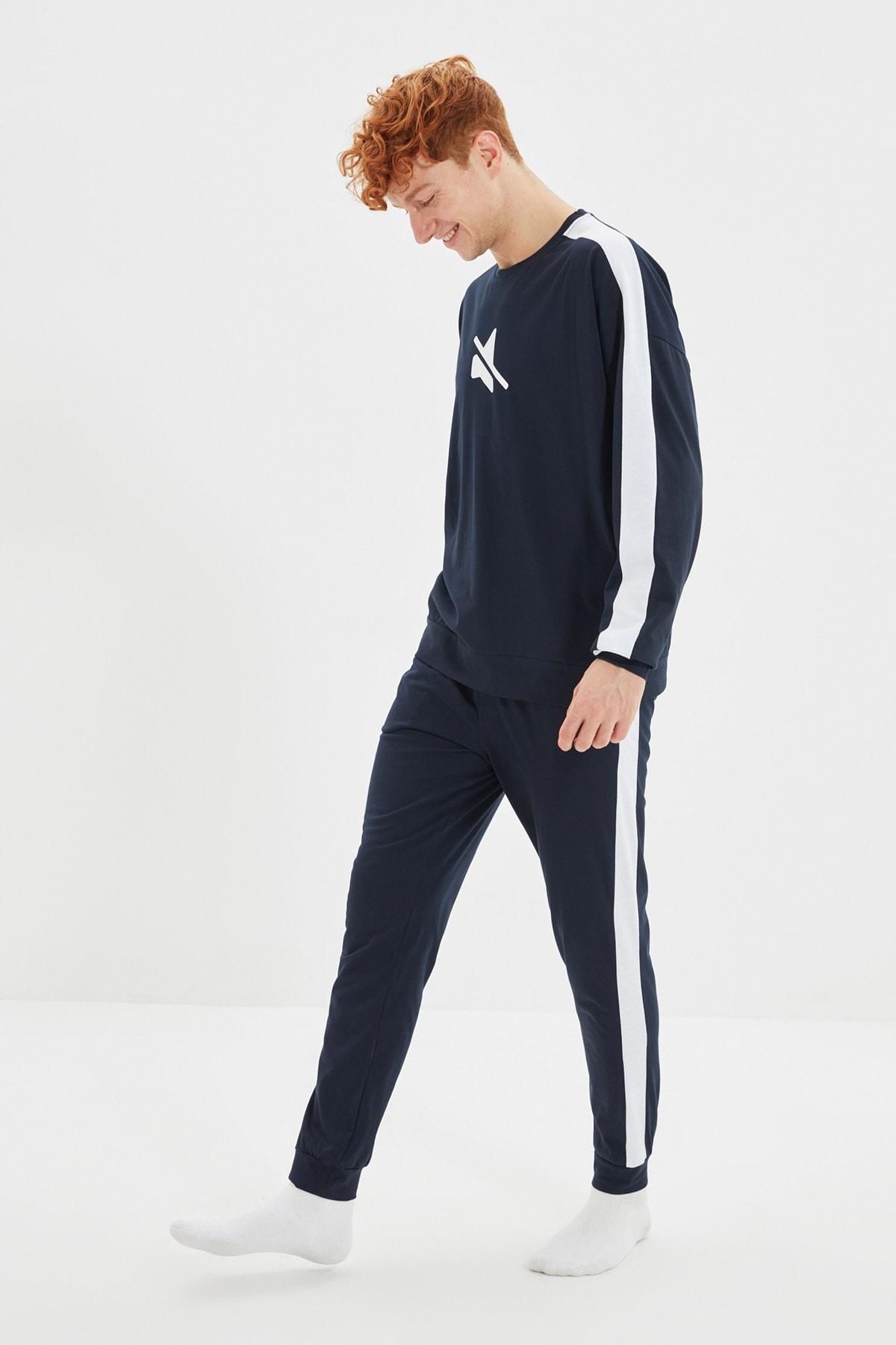 Темно-синяя вязаная пижама в полоску с принтом и деталями THMAW21PT0681