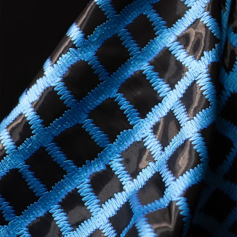 Темно-синяя, черная клетчатая жидкая блестящая атласная жаккардовая ткань для роскошного дизайнерского текстиля с металлической гламурной текстурой
