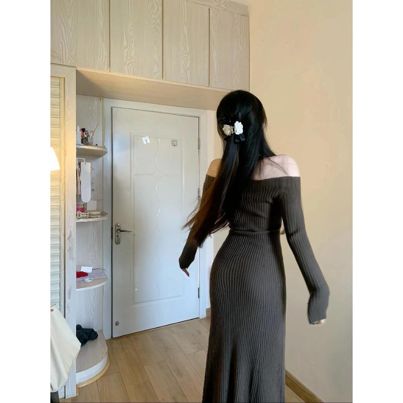 Темпераментное знаменитое длинное платье для вечеринки по случаю дня рождения, высококлассное, легкая роскошь, нишевое, сексуальное платье с открытыми плечами, вязаное, осеннее XL коричневый