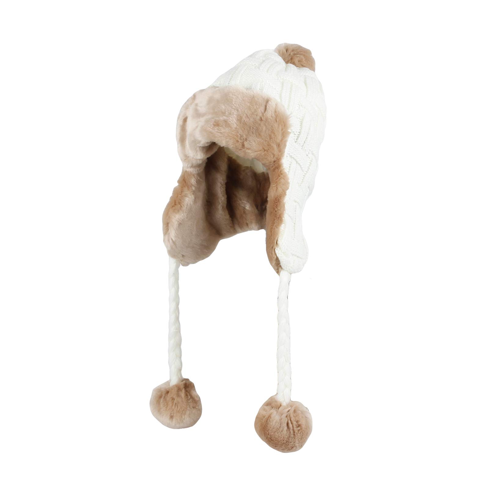 Теплая зимняя вязаная шапка с ушками и меховой подкладкой Moons FZ70022 (слоновая кость), Помпоны, Дизайн под плетение, слоновая кость