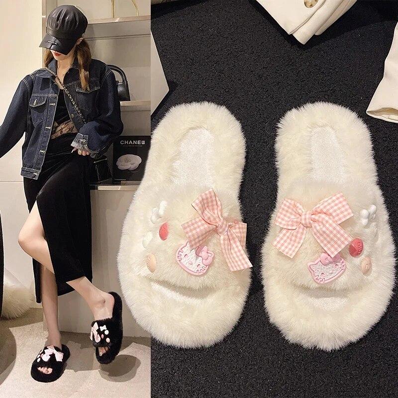 Теплые плюшевые тапочки для женщин, женская обувь на плоской подошве на низком каблуке с пушистым мехом, милые шлепанцы на платформе с животным принтом и узлом бабочки