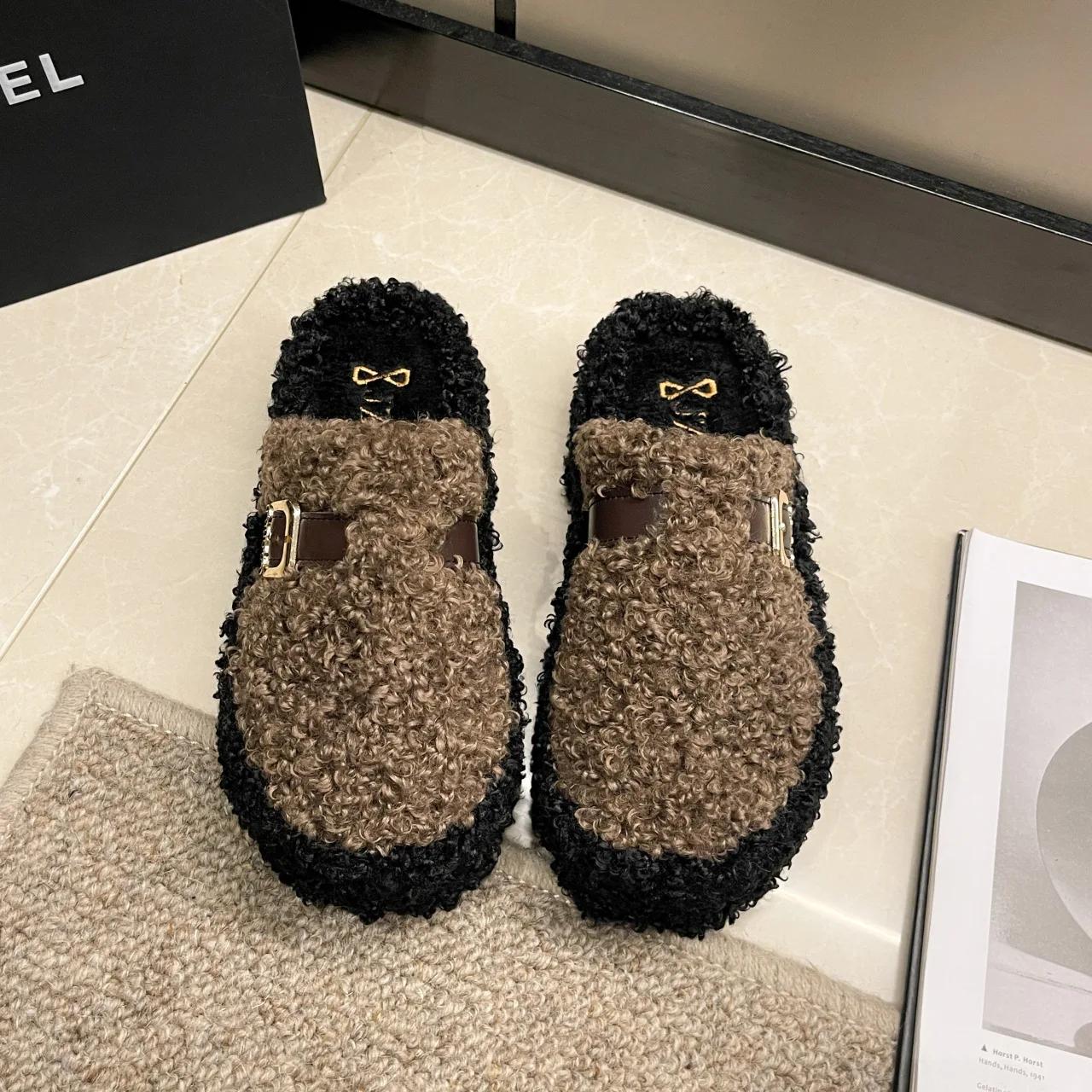 Теплые тапочки из овечьей шерсти, женские корейские модные плюшевые тапочки-мулы 2024 года, ретро-тапочки на открытом воздухе с мягкой пробковой пряжкой на плоской подошве 40 коричневый