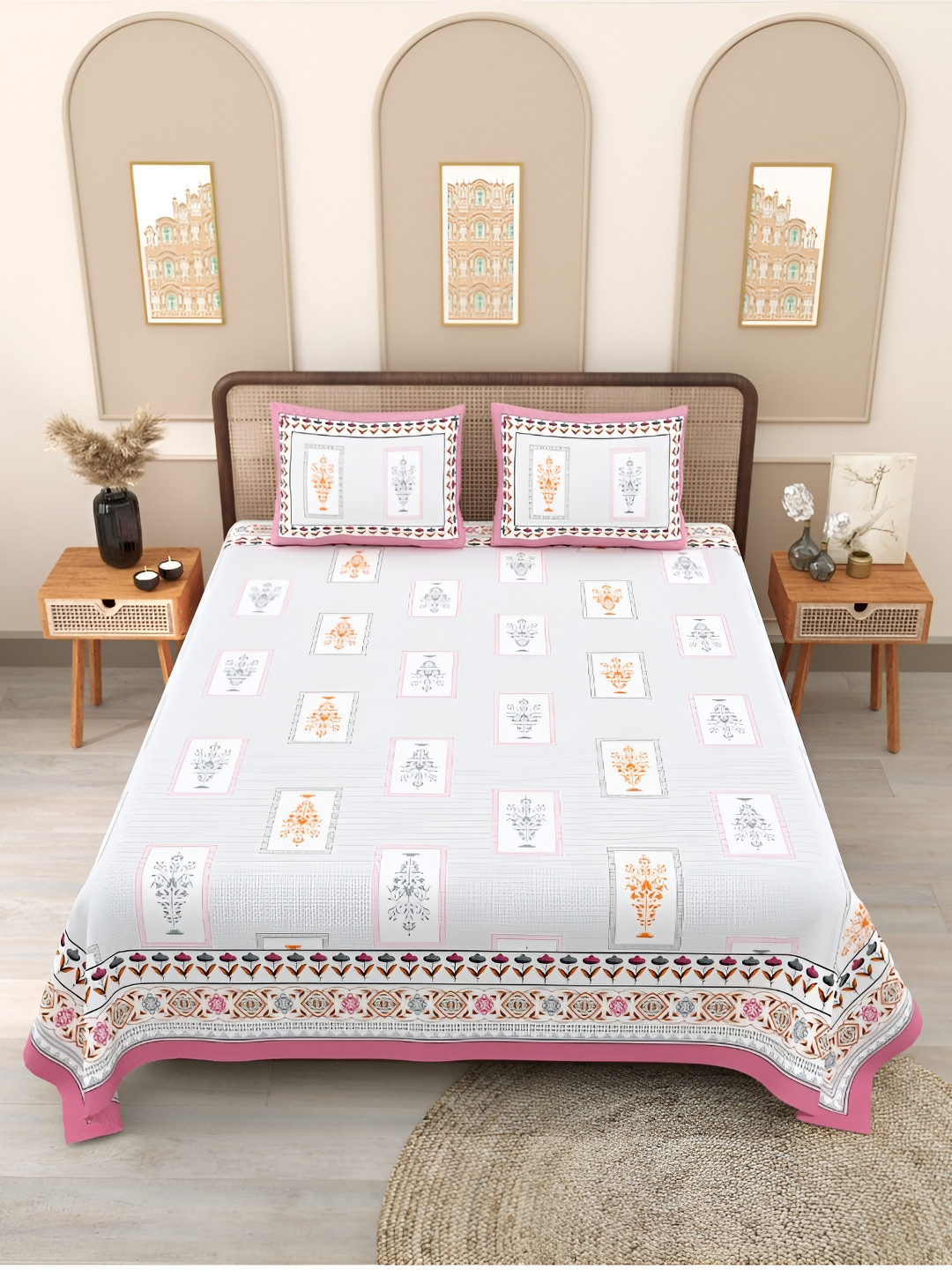 Block Print Story White Ethnic 210 TC Cotton Fitted Queen Bedsheet with 2 Pillow Covers, Grey