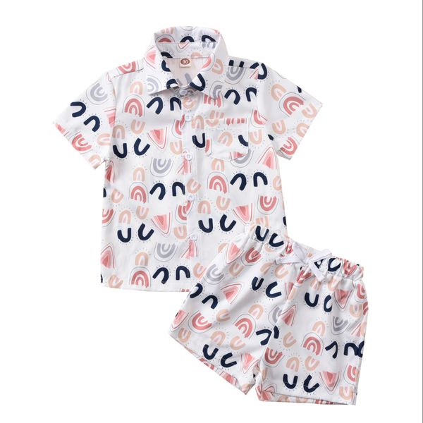 summer kids boys clothes sets 2pcs short sleeve lapel rainbow print +shorts set for children, White
