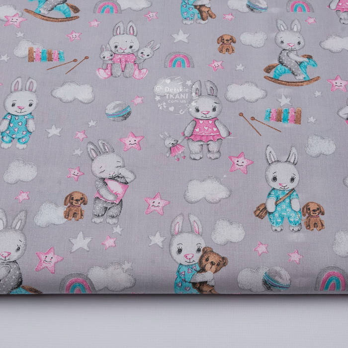 Ткань бязь "Зайчики на лошадках среди звёзд и облаков" на сером фоне №3806, Разные цвета
