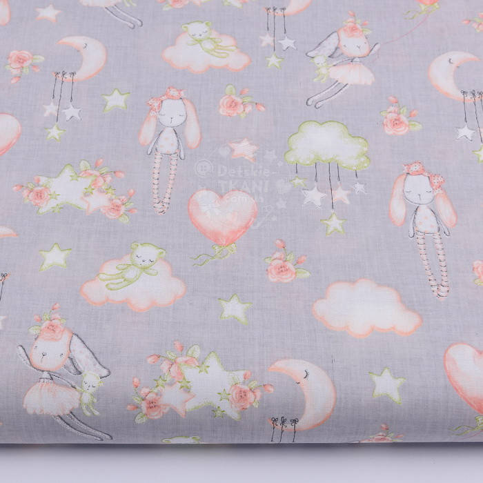 Ткань бязь "Кролики с шариком-сердечком" розовые на сером фоне, № 2722а, Серый