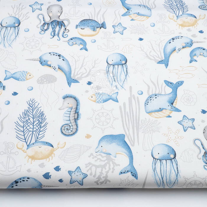 Ткань бязь "Морские коньки, черепахи, медузы, киты" голубые на белом (№4093), Голубой