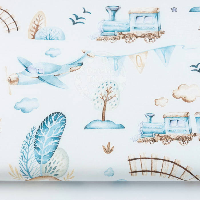 Ткань бязь "Самолёты и паровозы", цвет бирюзовый с коричневым, №2974, Белый
