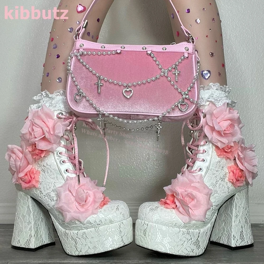 Lace Flower Ankle Boots Platform Pointed Toe Square Heels Lace-Up Mixed Color Side Zipper Fashion Luxury Elegant Women Shoes New