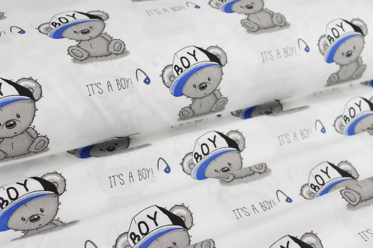Ткань мишки "ВOY" в бейсболке на белом фоне №1275