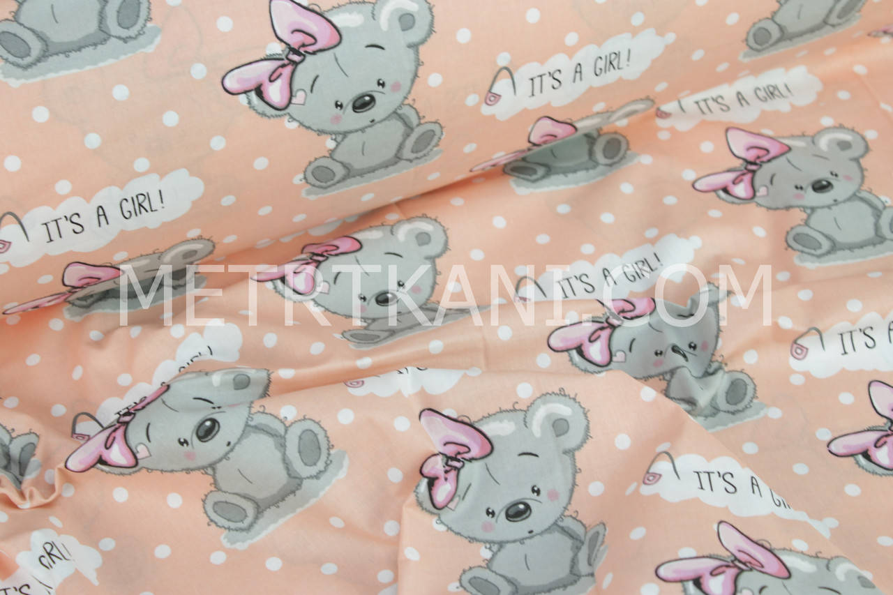 Ткань, мишки "GIRL" на персиковом фоне №881 Польский хлопок продается в нашем инернет-магазине от 50 см одного вида. На отрезы в длину 3 м одной ткани цена дешевле. Плотность 125 г/м2 Ширина этих тканей 160см +/- 1-2см предназначение бязи постельное белье, так же хлопковая ткань отменно подходит для все видов домашнего и детского текстиля, польская бязь качественная ,натуральная, яркая,плотная. Великолепно польский хлопок смотрится в игрушках, куклы тильда, изделиях ручной роботы, декора, пэчвор.