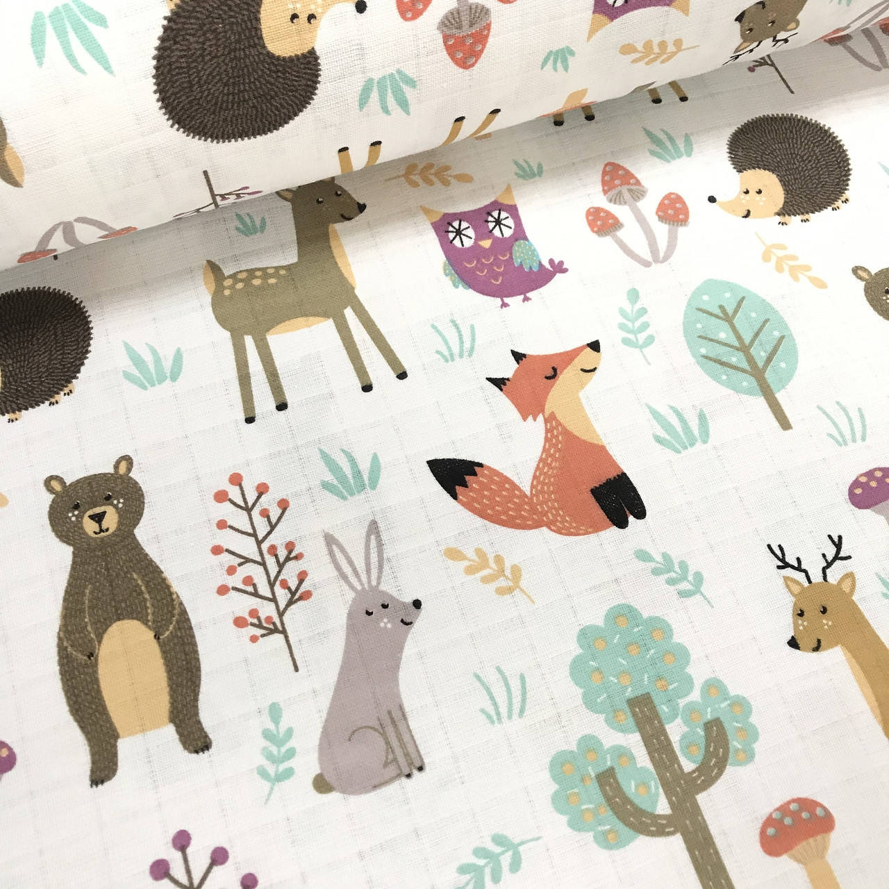 Ткань муслин Двухслойная животные с грибочками и деревьями на белом (шир. 1,6 м) (MS-T-0238), Разные цвета