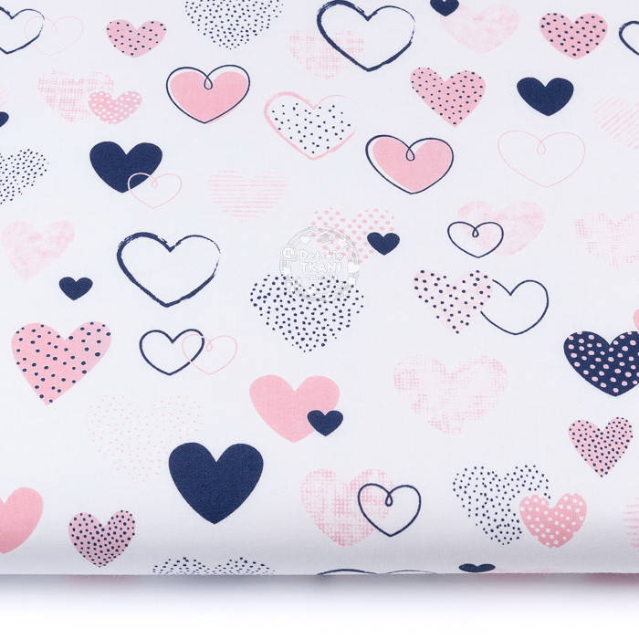 Бязь белого цвета с нарисованными сердечками тёмно-синего и розового цвета.