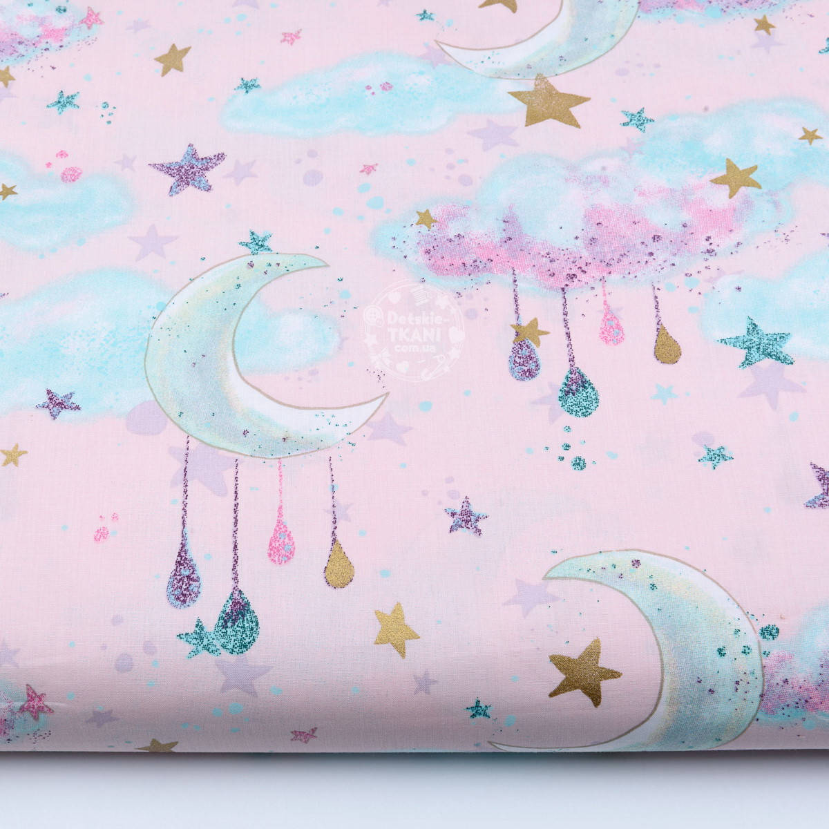 Ткань хлопковая "Облака и месяц с капельками" на розовом, коллекция Exclusive glliter, №1871а, Персиковый