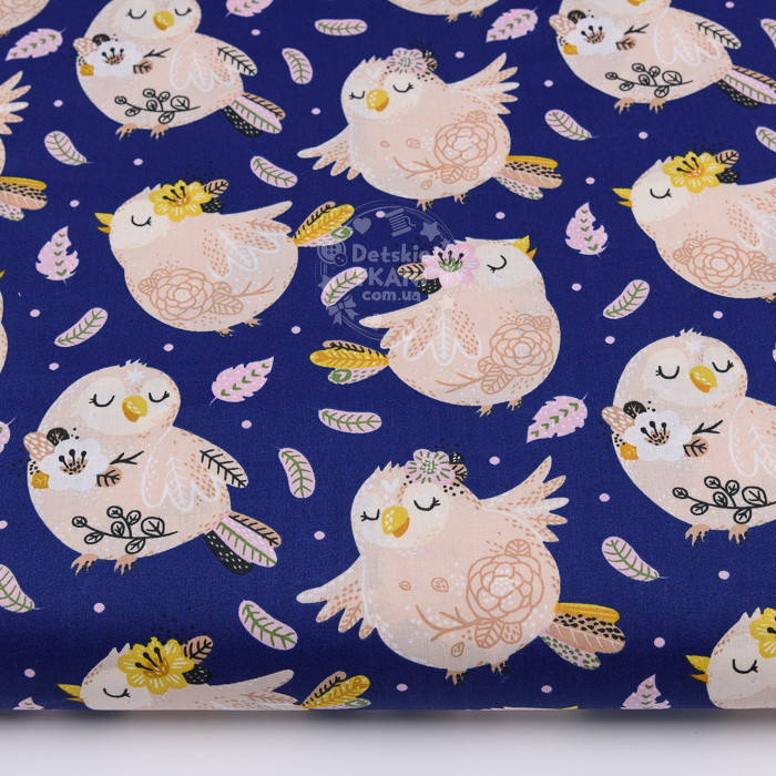 Ткань хлопковая "Толстые воробьи с цветочками" бежево-розовые на синем фоне №2611, Синий