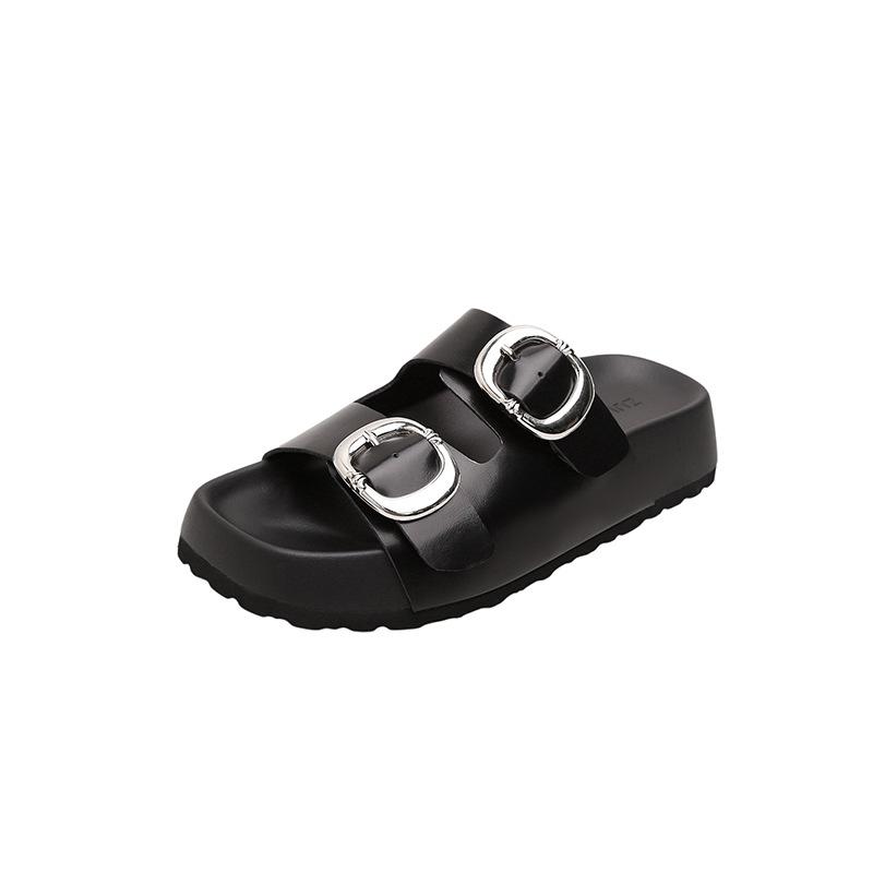 Толстоподошвенные шлепанцы для женской уличной носки лето новые с открытым носком увеличивающие рост модные с пряжкой-ремнем бисквитные пляжные прохладные шлепанцы 40 чёрный
