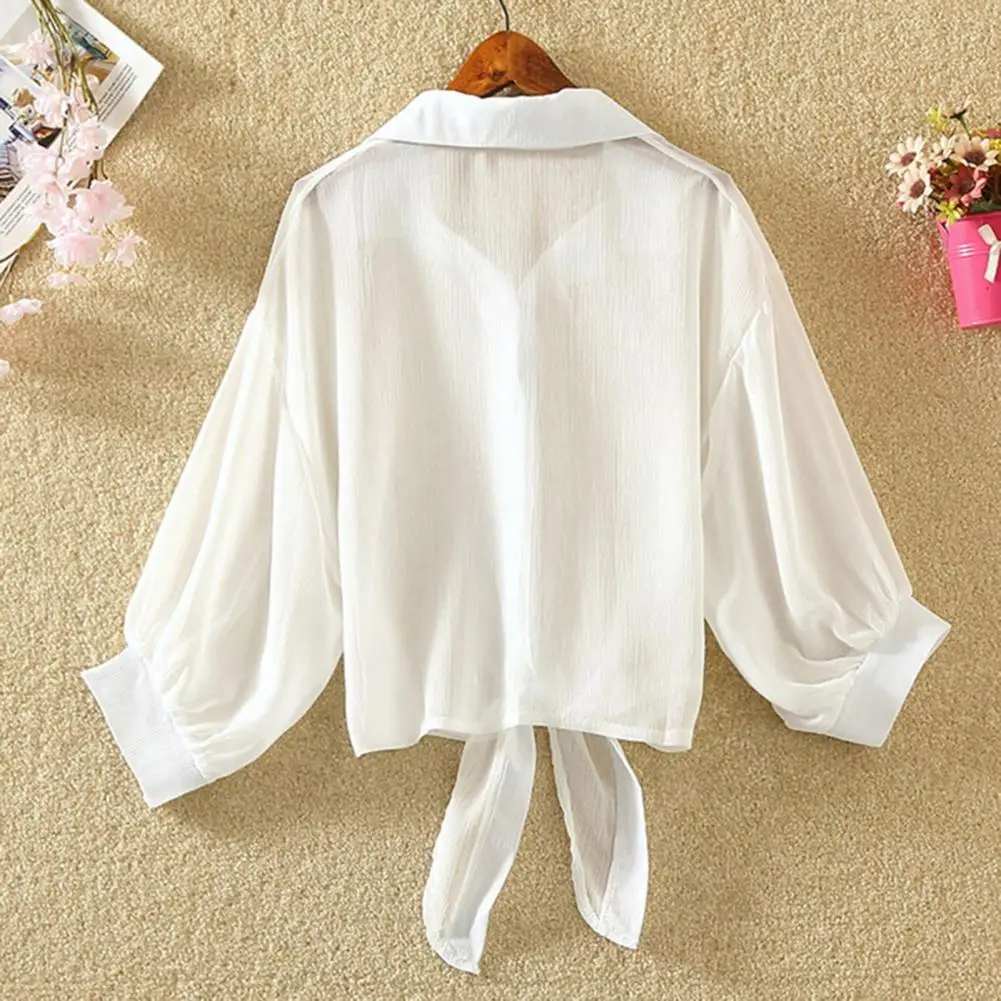 Тонкая Солнцезащитная короткая куртка, Женская пляжная рубашка в пляжном стиле с отложным воротником и рукавом до локтя, на шнуровке спереди, летняя шифоновая ультратонкая шаль, пальто, блузка