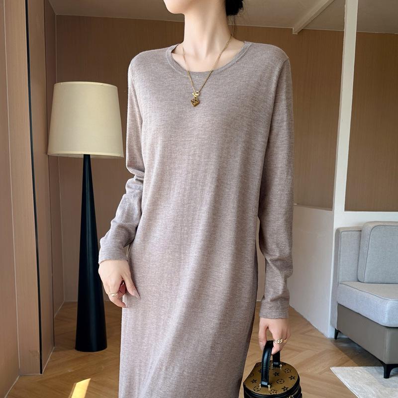 Тонкая шерсть 100% чистая шерсть Свободное платье макси с круглым вырезом, весенне-летний бесшовный стиль с V-образным вырезом. One Size