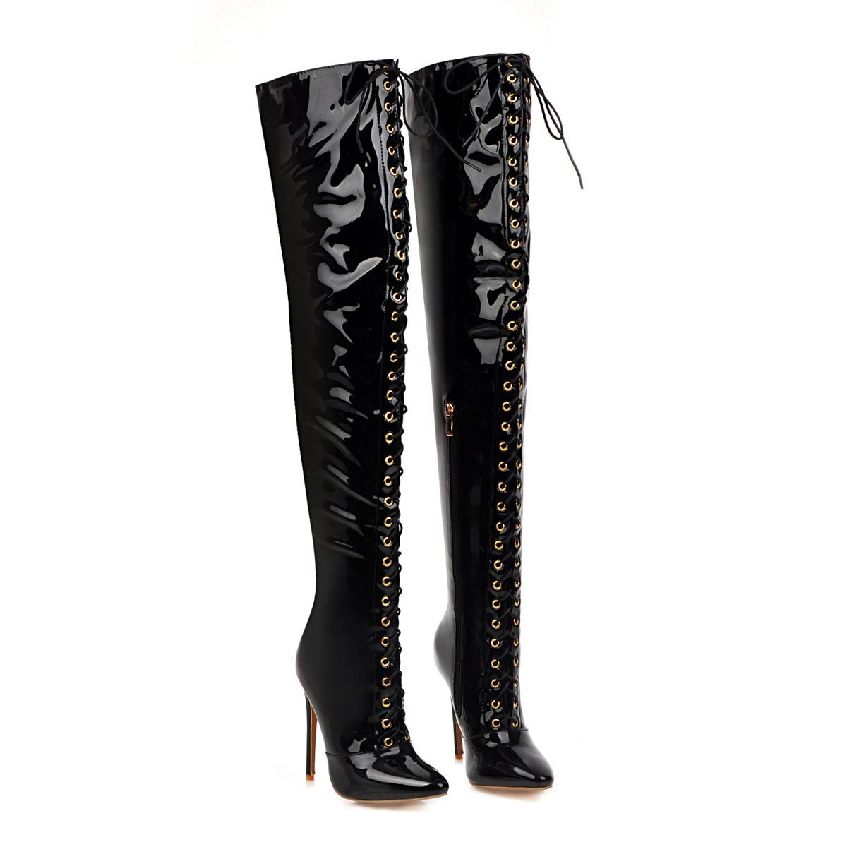 Тонкий каблук Острый носок На шнуровке Ботфорты выше колена 12 см Сексуальные женские ботинки из лакированной кожи Новые Черные Боковая молния Женская обувь 34 чёрный