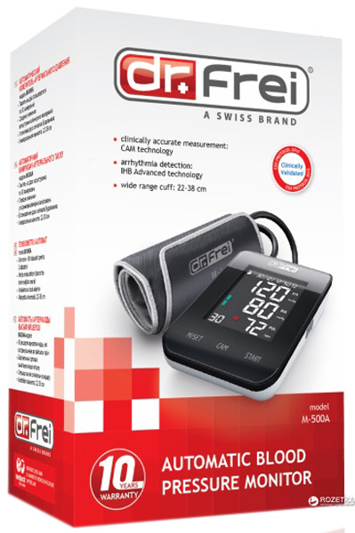 Тонометр автоматический на плечо от известной торговой марки Dr.Frei отличный выбор для тех, кто проводит измерения артериального давления и пульса в домашних условиях. Тонометр Dr.Frei M-500A оснащен большим сенсорным жидкокристаллическим дисплеем с САМ-технологией, которая обеспечивает максимальную точность измерений давления. В приборе применена передовая технология IHB, при помощи которой определяется аритмия во время измерения артериального давления.