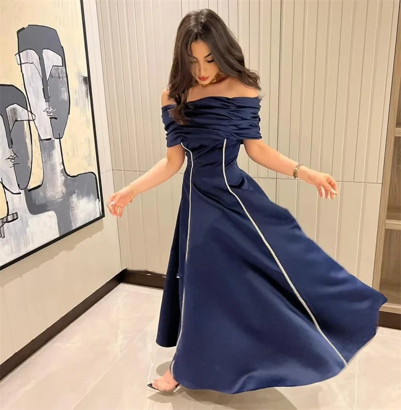 Трапециевидные темно-синие атласные вечерние платья с открытыми плечами, Саудовская Аравия, Короткое женское платье, женские платья до щиколотки для выпускного вечера в Дубае