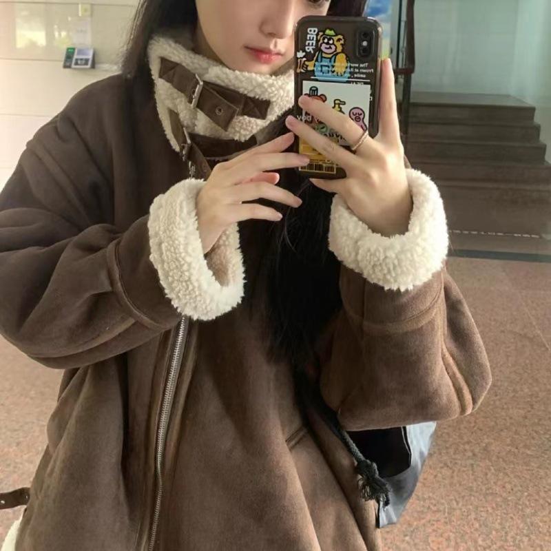 Трендовая зимняя женская мотоциклетная куртка из искусственной овчины с воротником-стойкой - Ретро повседневный парный стиль L коричневый