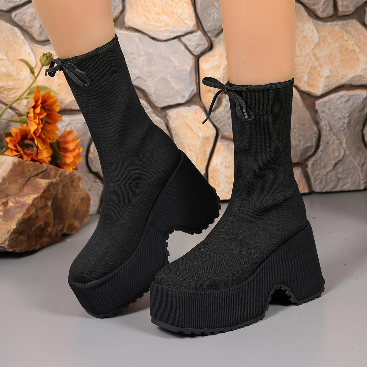 Тренд 2025 Женские Новые Челси Туфли Платформа Женские Вязаные Ботильоны-носки до щиколотки Мода Зимние Снежные Боты Женские Обувь на Высоком Каблуке с Бантом 38 чёрный