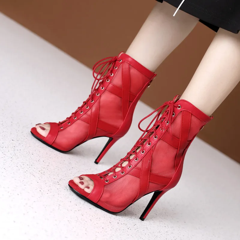 Сандалии женские на высоком каблуке, с открытым носком, сетчатые, с перекрестной шнуровкой и молнией