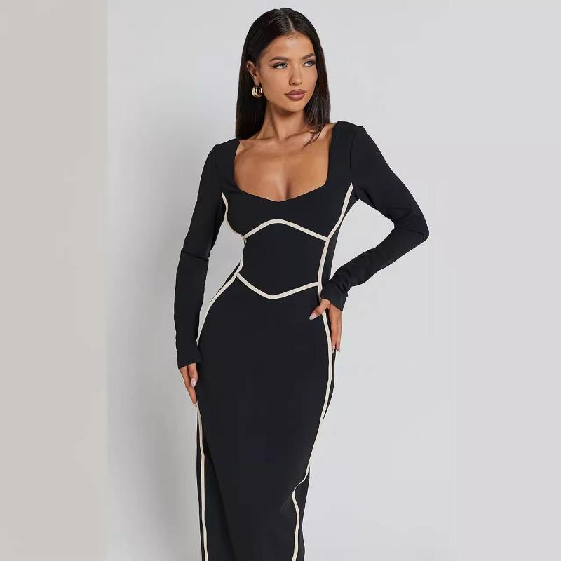Трикотажное длинное платье с открытой спиной, сексуальное длинное женское платье с U-образным вырезом, контрастное платье с талией XL чёрный