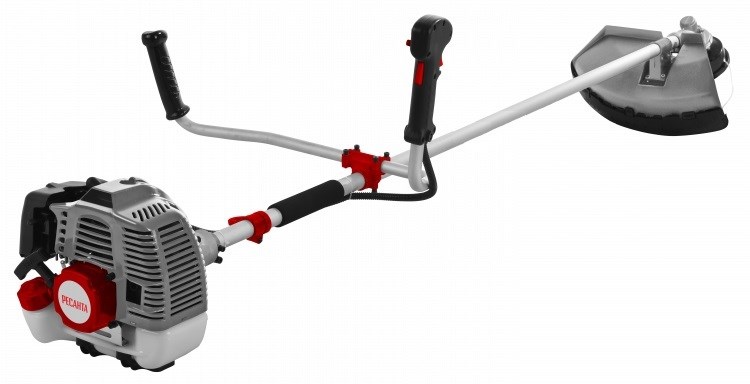 Триммер РЕСАНТА БТР-2900П, 2.9 кВт, 3.94 л.с., 9500 об/мин, бензиновый, реж.эл.: леска/диск, U-образная рукоять, плечевой ремень, верхнее положение двигателя, 9 кг (70/2/44), БТР-2900П