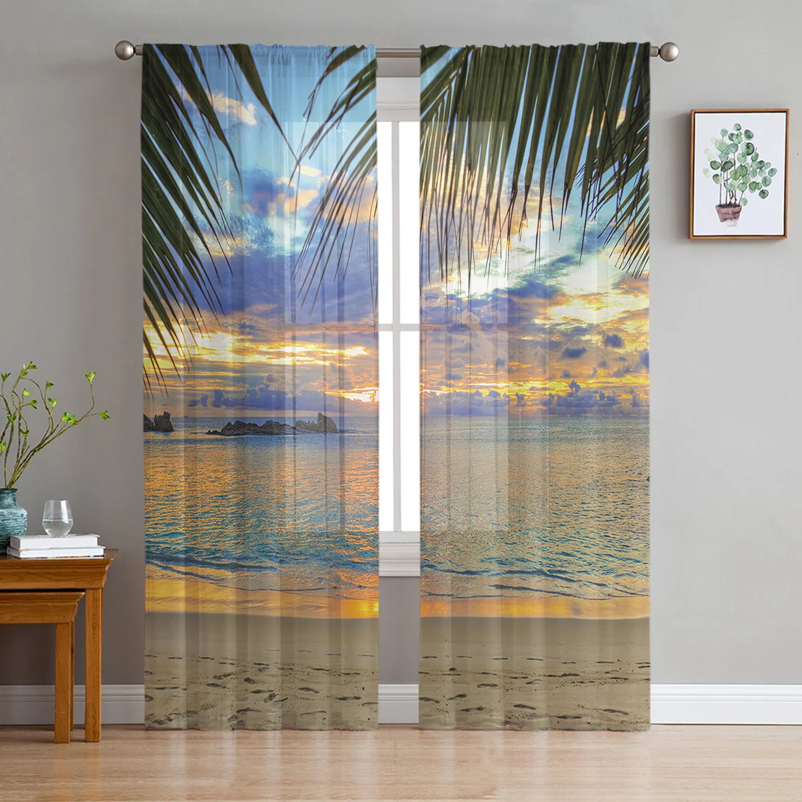 Тропические пляжные закаты, прозрачные шторы с пальмовыми листьями для гостиной, спальни, кухни, шифоновые тюлевые шторы, Декор для дома, от...
