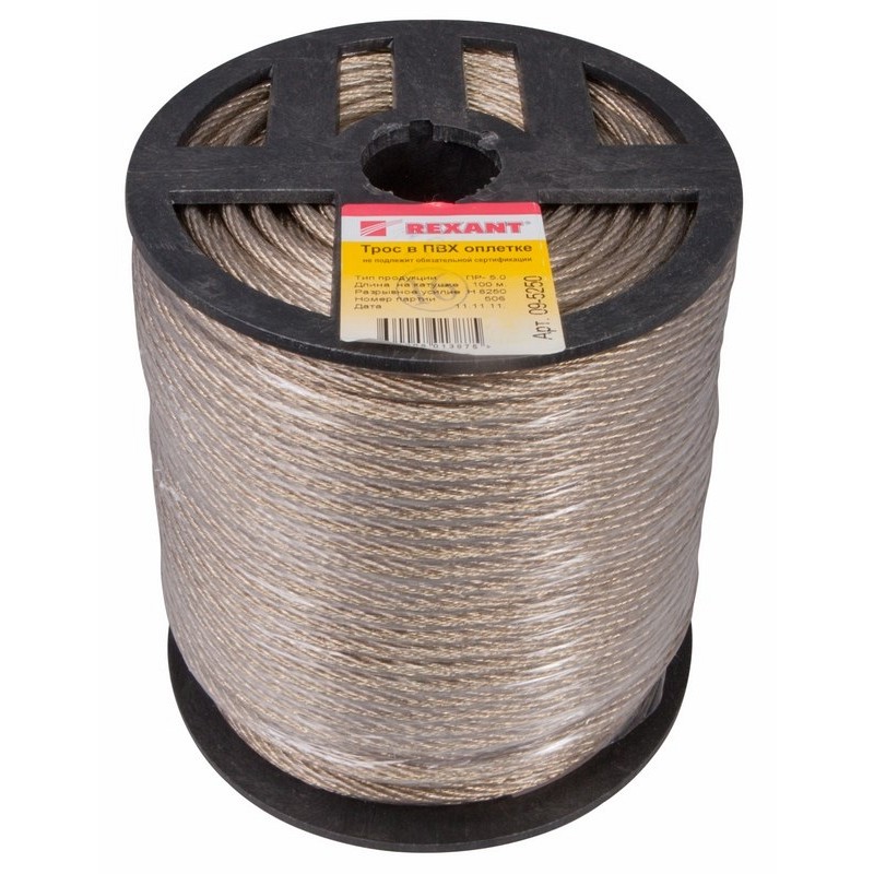 Трос в ПВХ оплетке Rexant 09-5250 стальной D= 5,0мм, прозрачный (бухта 100м), 09-5250