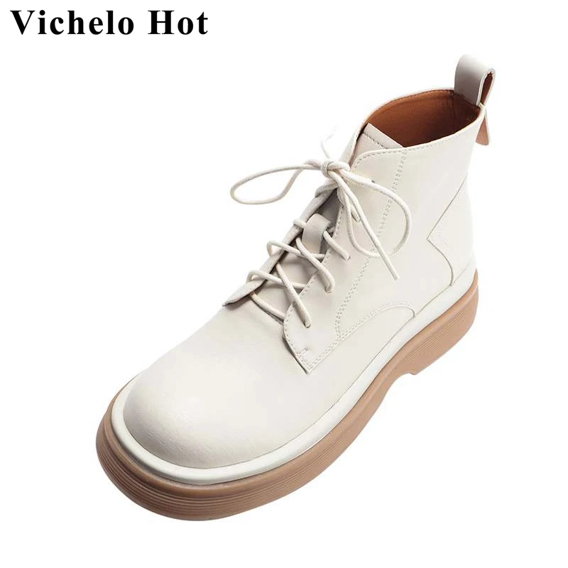 Популярные современные ботинки Vichelo из коровьей спилковой кожи с круглым носком на среднем каблуке, на платформе, восточные однотонные ботильоны с нейтральным шитьем и шнуровкой
