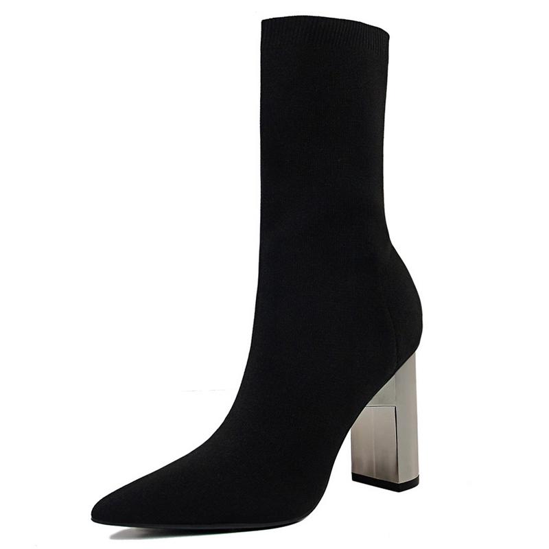 Туфли Женские Эластичные Ботильоны-носки Металлический Блок Каблук Женские Ботинки Сексуальные Ботильоны на Высоком Каблуке 2025 Новые Женские Ботильоны Большой Размер 43 43 чёрный