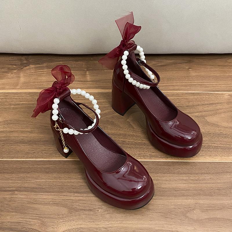 Туфли Мэри Джейн на высоком каблуке женские 2025 весна и осень новая модель толстый каблук одинарные туфли сказочный стиль жемчужная цепочка высокий каблук одинарные туфли маленькие кожаные туфли 40 бордовый