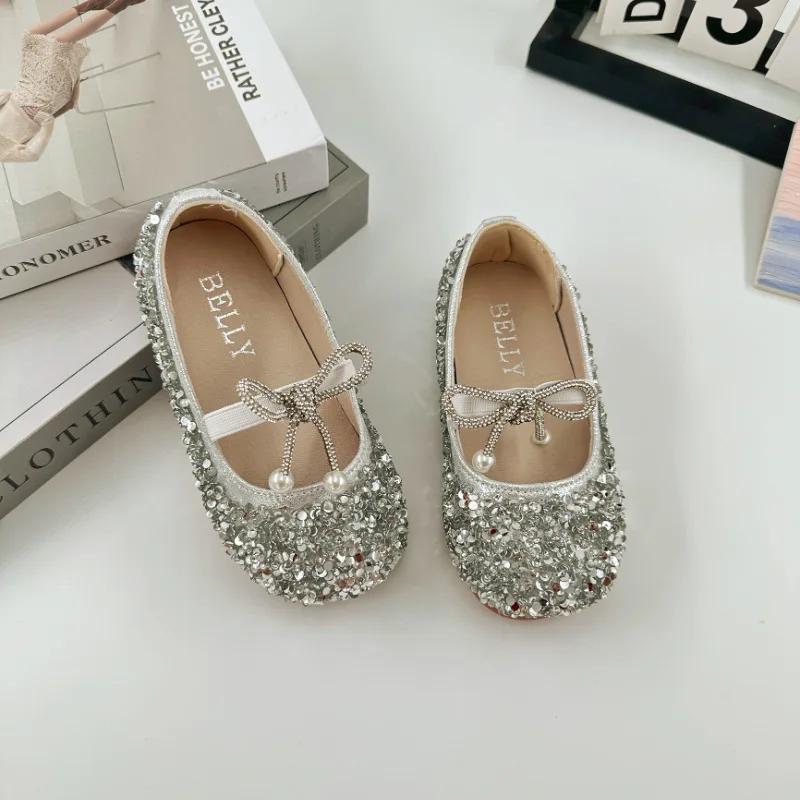 Туфли для девочек с блестками для свадебной вечеринки, детские туфли на плоской подошве со стразами и подвеской, милые детские туфли принцессы с эластичной резинкой 21 серебряный