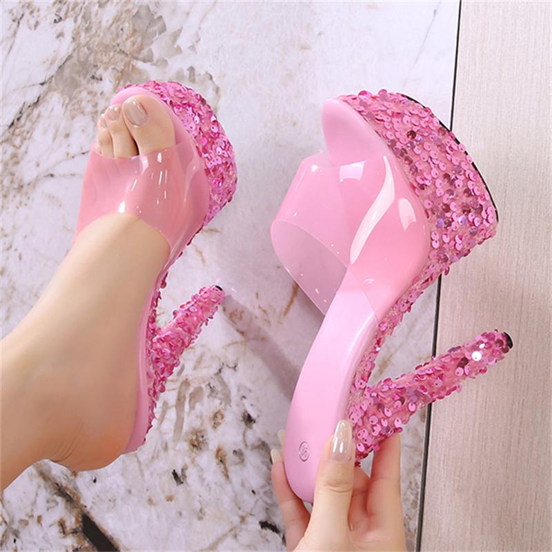 Туфли женские прозрачные из ПВХ с открытым носком, расшитые блестками, на платформе и шпильках, на высоком каблуке, для ночного клуба, сексуальная обувь 34 розовый
