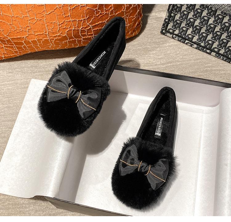 Туфли на плоской подошве из натурального меха кролика, женские балетки с бантом и кристаллами, женские хлопковые плюшевые мокасины, большой размер 42/43, зимние мохнатые туфли 6 чёрный