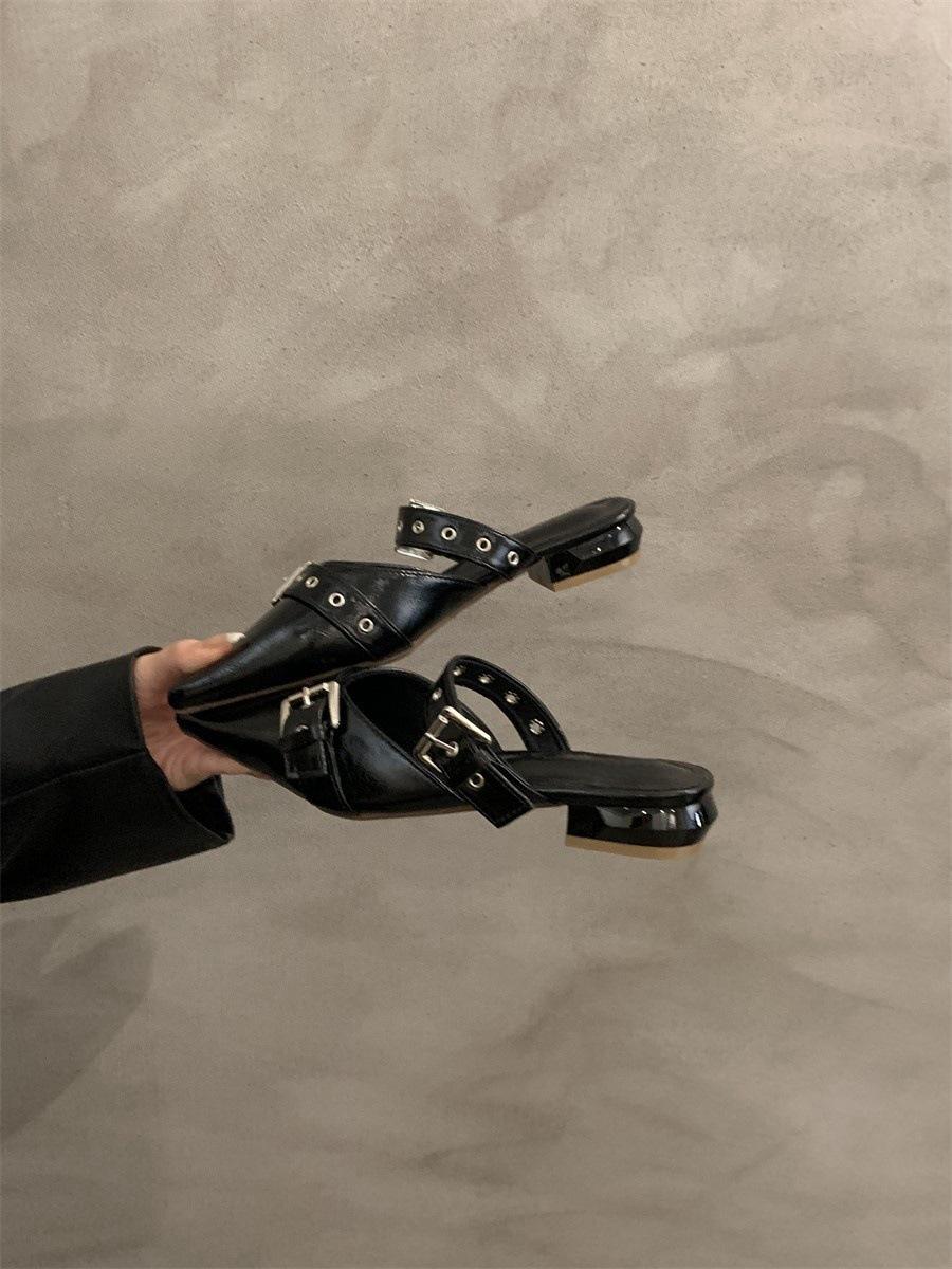 Туфли-полушапки на грубом каблуке с застежкой-молнией, верхняя одежда, весна и лето 2025, новые ретро-туфли с заостренным ремнем и пряжкой, черные одинарные туфли, женская обувь 40 чёрный