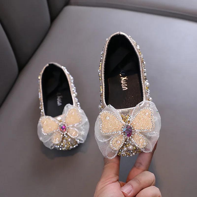 Туфли принцессы из кожи для девочек, детские балетки со стразами и жемчугом, весна-осень, модные детские повседневные школьные балетки 21 золотой