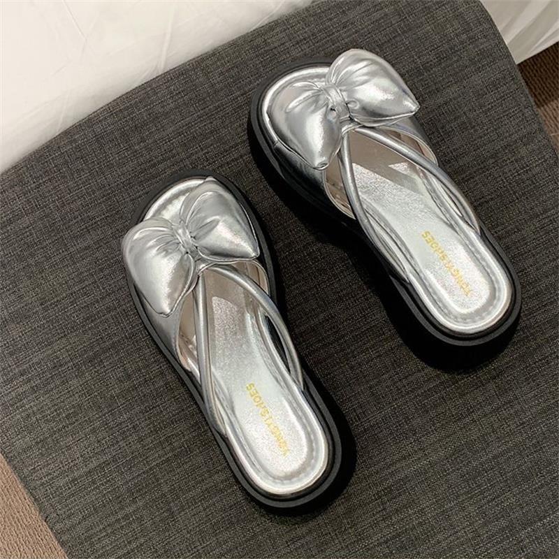 Туфли-шлепанцы в стиле феи с бантом, на толстой подошве, увеличивающие рост, крутые, женские, для лета 2025, новая мода, красивые сандалии для ношения с юбкой 40 серебряный