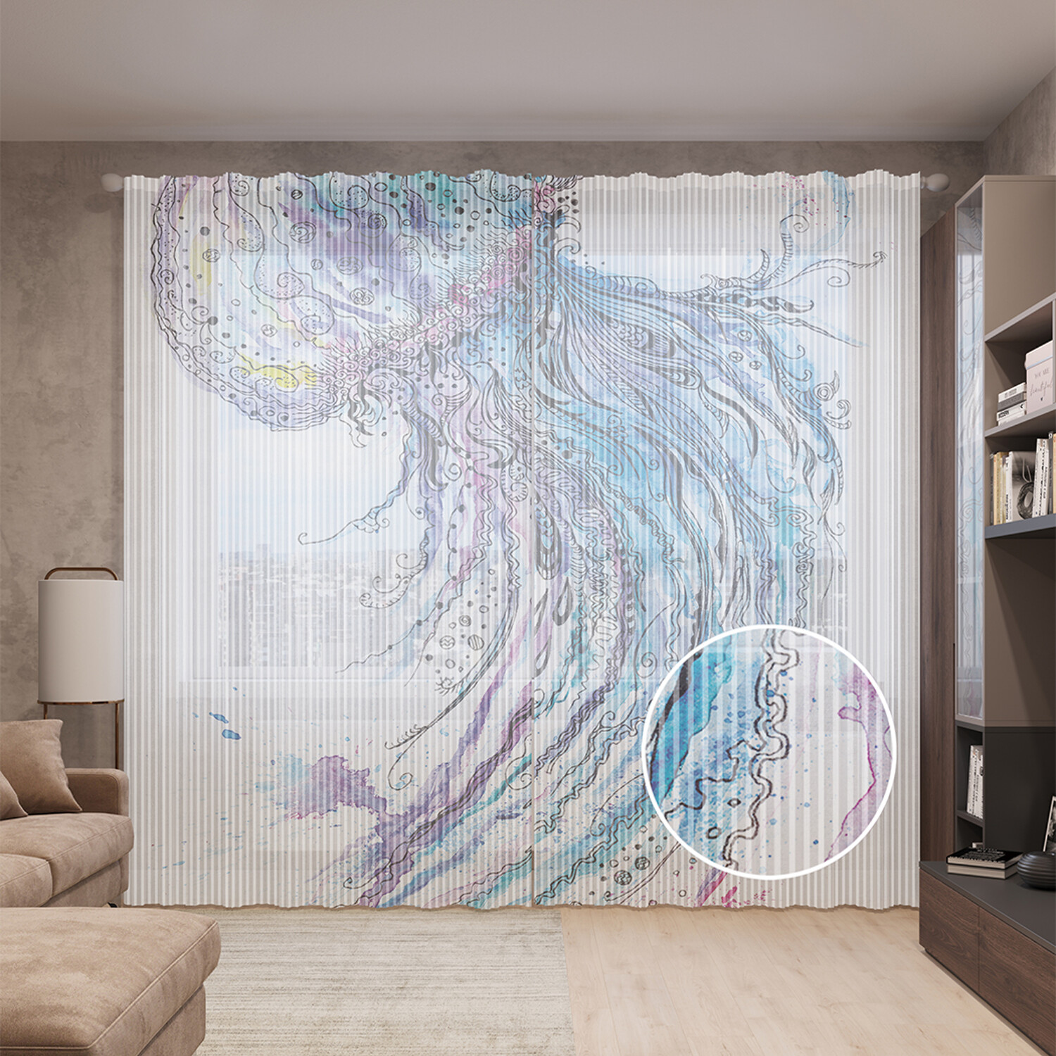Тюль вуаль на шторной ленте с принтом JoyArty "Жалящая медуза", 310х265 см, Жалящая медуза