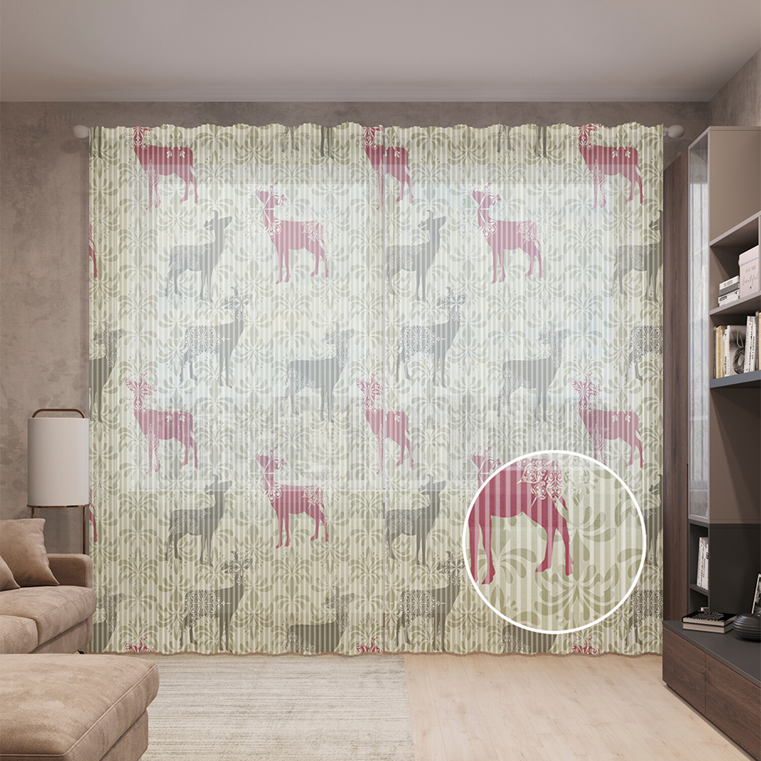 Тюль вуаль на шторной ленте с принтом JoyArty "Олени и снежинки", 310х265 см, Олени и снежинки